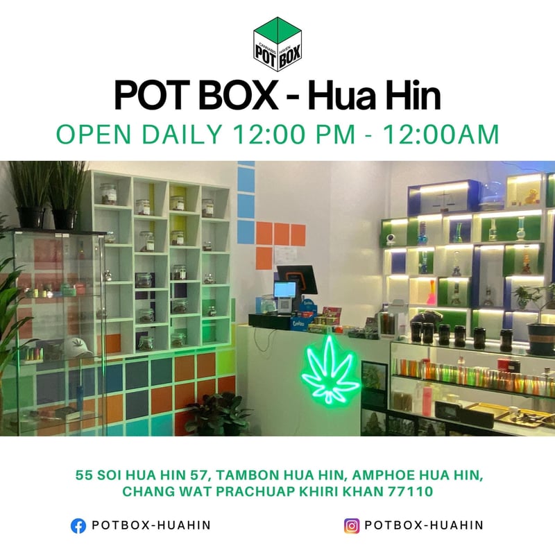 Welcome to our open daily cannabis shop, where we specialize in curating a premium selection of cannabis products for enthusiasts and newcomers alike. Our friendly and knowledgeable staff are here to guide you through an immersive experience, offering personalized recommendations tailored to your desired outcome. Step into a world of endless possibilities; don't miss out on your cannabis journey – we're open daily to help make it memorable.💥🔔 PotBox-Hua Hin📦 55 Soi Hua Hin 57, Tambon Hua Hin, Amphoe Hua Hin, Chang Wat Prachuap Khiri Khan 77110