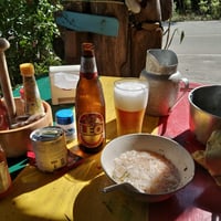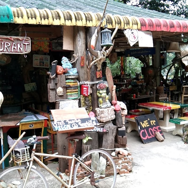 Fantastic delicious authentic Thai food, low prices (half of what you pay on the beach) and a dining experience on old tables and benches clamped together from old driftwood and decorated with whatever this old pirate had found on the island or washed up on the beach. I believe I saw an old vintage dentist chair somewhere.