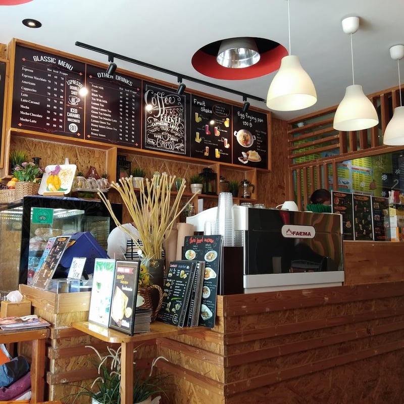 Very tasty Cappuchino frape. Mango shake... not so bad. Very small place on the road, but nice.