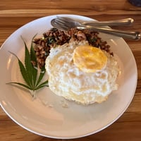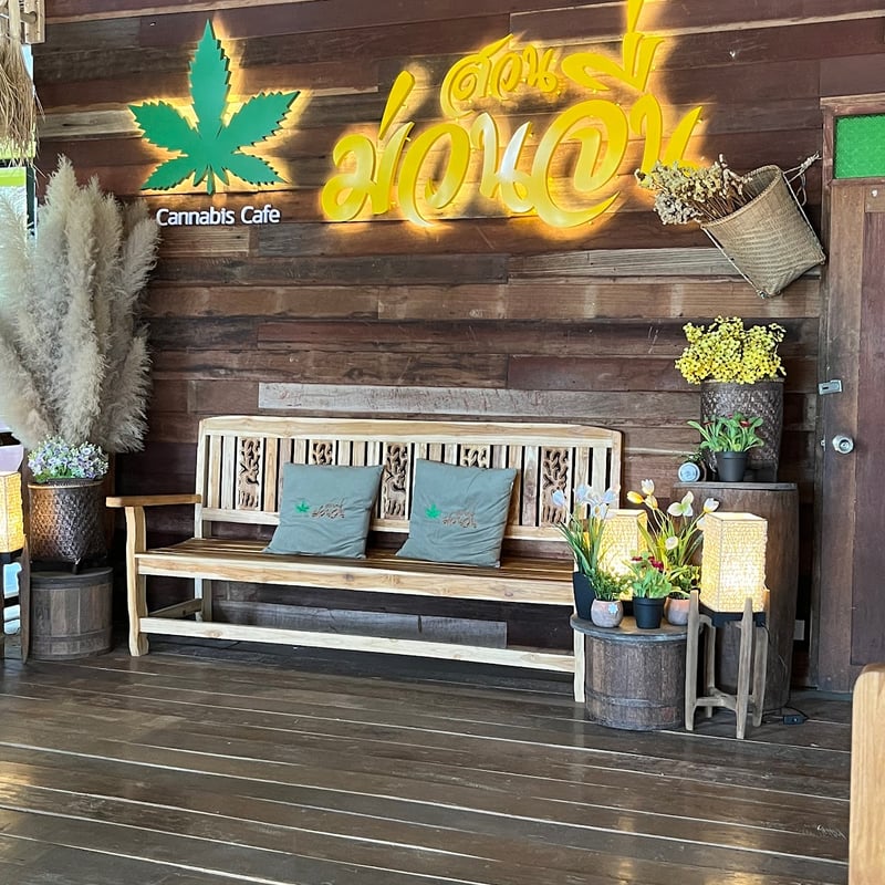 เลยจากพระธาตุแช่แห้งมาไม่ไกล มีที่จอดรถหน้าร้าน มีกาแฟ ของหวาน และอาหาร น้ำเงี้ยวหวานไปนิด แต่อร่อยกลมกล่อมและไม่เผ็ด ผัดไทโอเค กระเพราะก็โอเค อาหารจะเสิร์ฟพร้อมกับใบกัญชาทุกเมนู ราคา 50 บาท ไม่แพง บรรยากาศดี ลมเย็น โต๊ะไม้ เก้าอี้ไม้ พื้นไม้ ห้องน้ำสะอาด